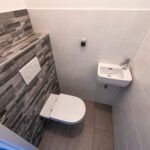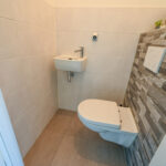 De schitterende, volledig betegelde badkamer vormt een ware eyecatcher. Deze is uitgerust met een dubbele douchegelegenheid, een breed wasmeubel met twee moderne waskommen en een design handdoekenradiator.